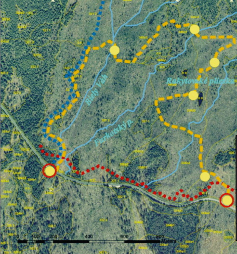 A szóban forgó területen eddig nem vezetett jelzett turistaút, így a Magas-Tátra legkisebb tavai közé tartozó Rekettyés-tavacskákat (Rakytovské pliesko) sem lehetett megközelíteni. A fenti térképvázlaton sárga színnel van jelölve az új tanösvény, az ennek vonalán látható sárga karikák az információs táblák helyét mutatják. A pirossal jelzett útvonal valójában a Csorbató – Podbanszkó közötti zöld jelzésű turistaút, az ebből északra elágazó, kék jelzésű turistaút pedig a Jamszkó-tóhoz (Jamské pleso), majd tovább a Krivánra vezető kék jelzésű turistaúttal azonos.