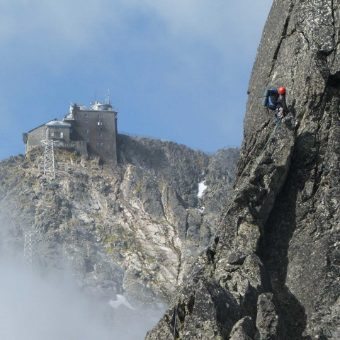 Este 6 óra van, mire lemászunk a Villa-gerinc végén, ami várfalként ugrik ki a Lomnici-csúcs tömegéből. A felmenet a csúcsra már csak levezetés. Hamarosan megjön a Csáki-Szász páros is. Nekik ez a két nap nemcsak hegyi élvezet, hanem egyben célzott erőnléti edzés volt, ugyanis a Kaukázusba készülnek. Az utolsó két emberünket, Szalacot és Márkusz Rolandot már a csúcsbüfében várjuk meg, nekik is kikérve a frissítő italt. Még megcsodáljuk a Téry-házba utánpótlást szállító helikpotert, aztán teljes létszámban elindulunk lefelé a déli oldalon. Éjfél körül alaposan elfáradva érkezünk Tátralomnicra. Csak magamban ütközök meg Gergő összegzésén, mely szerint jókora szenvedés volt ez a két nap. Én inkább kihívásnak és próbatételnek éreztem, amit nem sokan vállalnak, és amit a Tátra ezúttal is páratlan hegyi élményekkel jutalmazott.