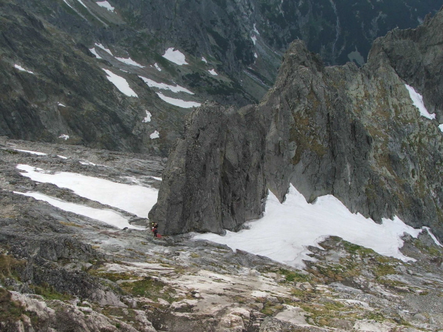 Másnap szép időre ébredve 7-kor indulunk a Késmárki-csúcs felé, és 10 perc alatt ott vagyunk. Innen a több ágra szakadó gerinc mellett kicsit kanyargósan megyünk le a Késmárki-Villa-horhos közelébe. Maga a horhos olyan szűk, hogy nem férünk el mindannyian, ezért csak a kezdő páros megy oda. Lassan indul a mászás, talán a bemelegedés hiányzik. Tibivel és Gergővel egy óránál többet várunk, mire a Keleti-Villa-csúcs igen látványos gerincén feljut a másik két páros. Mint kiderült, rosszul emlékeztem ennek nehézségére. Egy korábbi mászás szép emlékei alapján nagy mellénnyel élvezetes III-asként ecseteltem a valójában V-ös nehézségeket, és ezt a tévedésemet a fiúk kissé megkopott humorral értékelték. A várakozás közben átfázunk, elunjuk, Tibi elhatározza, hogy a Keleti-Villa-csúcs északi padján kikerüli a csúcstömböt. Kezdetben nem túl nehéz, de a végén kártyavárként összerakott kőlapok között, komoly aggodalmammal kísérve óvakodik fel az északi padra, és mögötte a Felső-Villa-horhosba, ahová a többiek szellős (ijedősebbek esetleg szellentős) ereszkedéssel érkeznek. Követjük őt, és ezzel a rövidítéssel meg is előzzük a többieket.