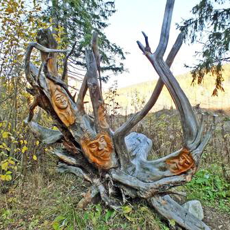 gyökérzete eredeti fafaragványok képében kel életre keze munkája nyomán. Szemet
