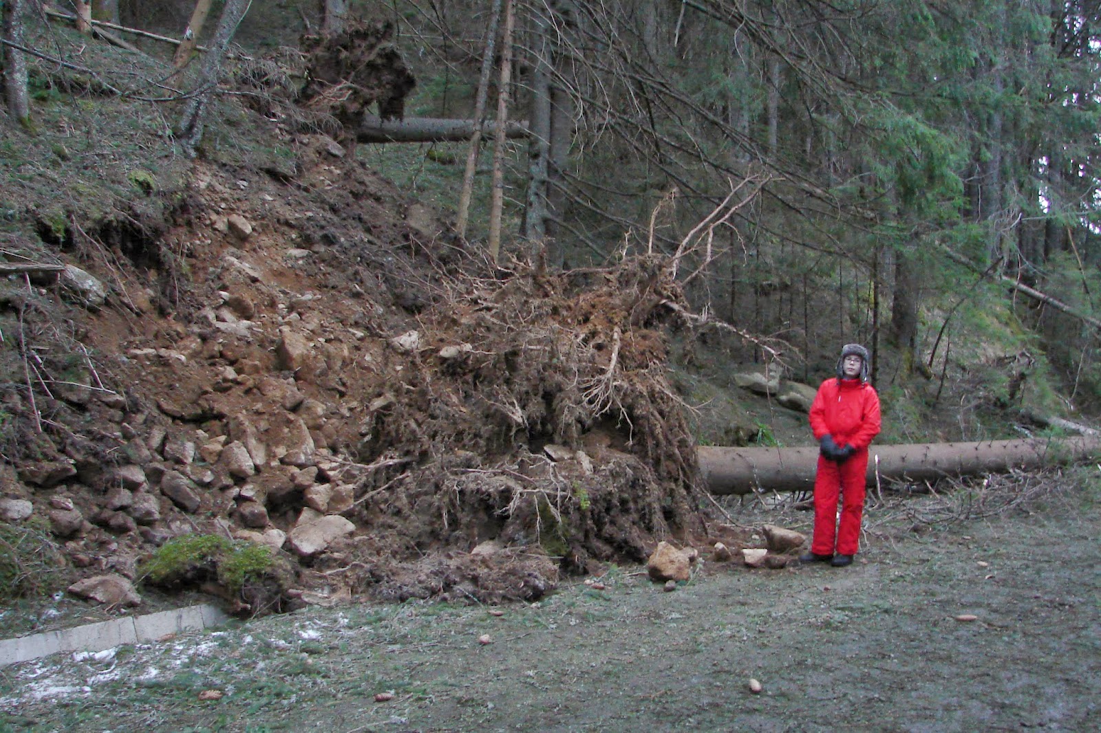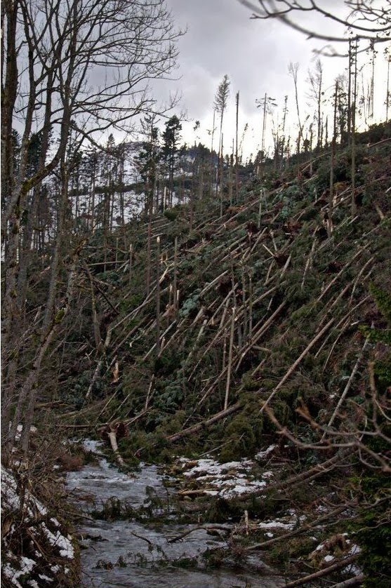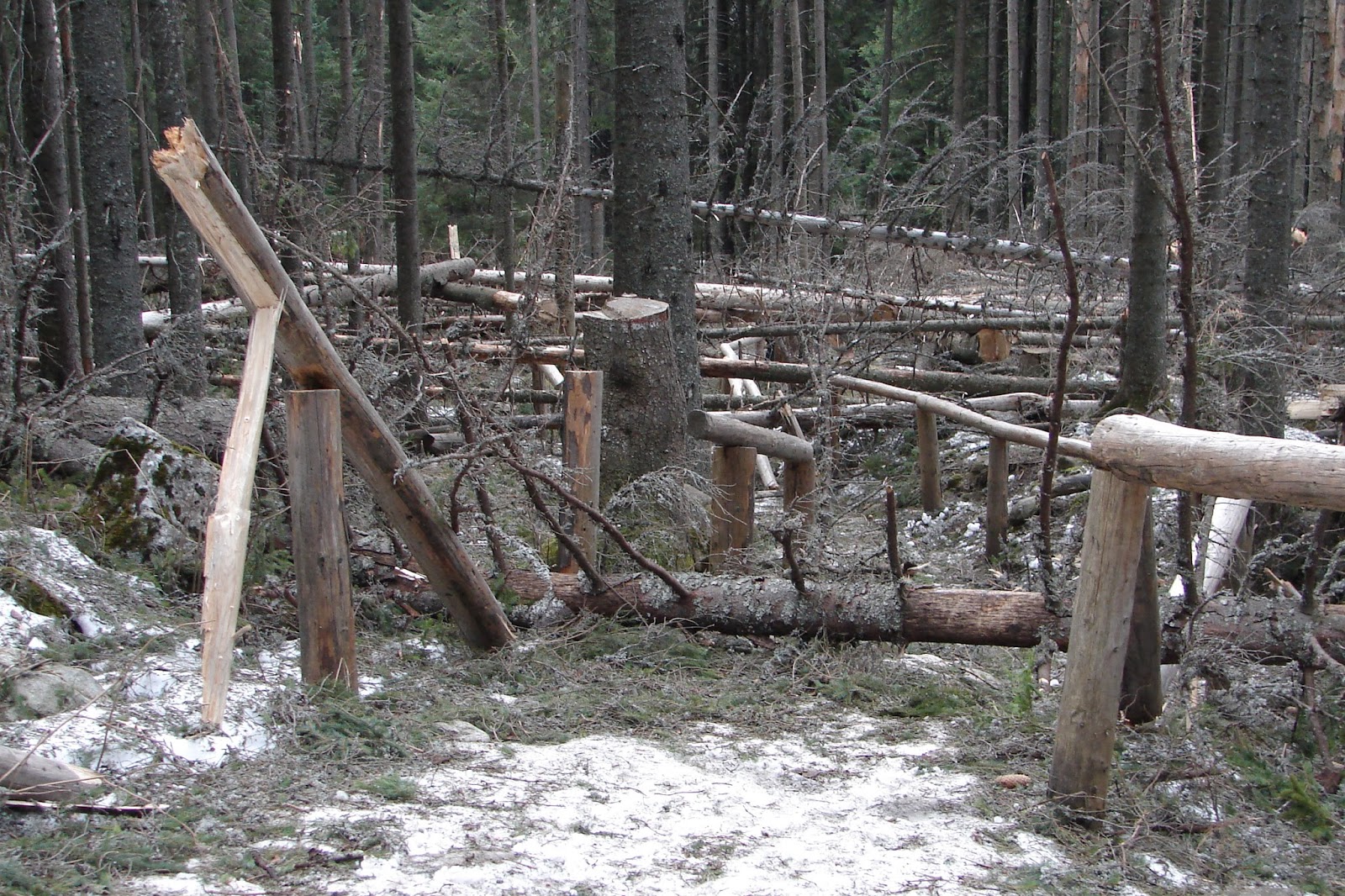 nyomon gyökerestől kidőlt, vagy derékban kettétört fenyők maradványai