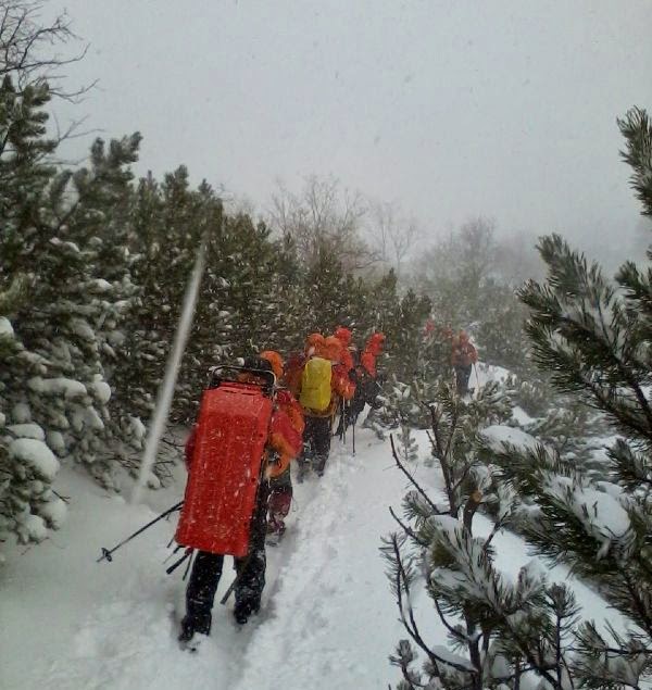 a sérültet a hegyimentők ott lévő szánjával megpróbálják lehozni a menedékházba. Miután megtalálták, a