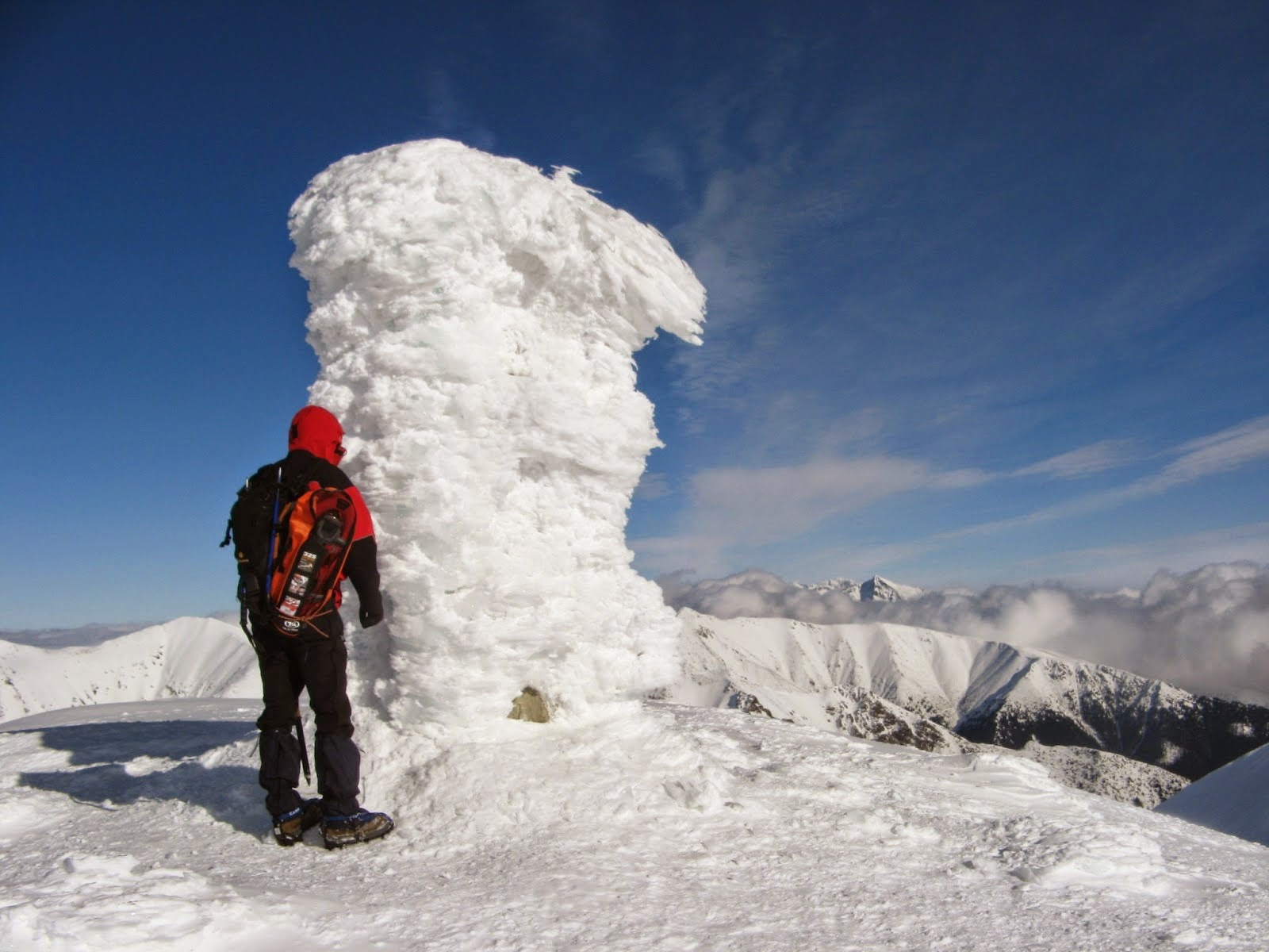 bivakhely, valaki itt táborozhatott. A zúzmarás csúcsoszlop takarásában van egy