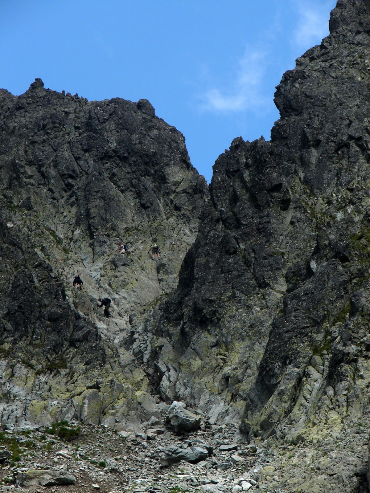 egyre magasabbra a törmelékes hegyoldalon egy sziklavályú felé. A vályú bal