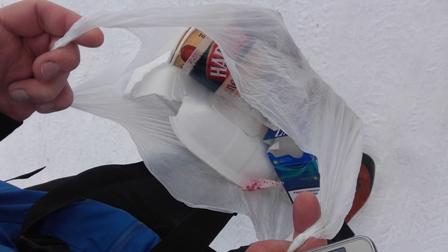 a magunkkal hozott reklámszatyorba. Az üres sörösüvegek is a hófalban végezték,