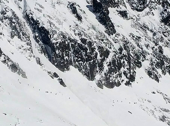 kor egy 20 fős csoport keresztezte a lejtőt és a lavinapályákat, köztük a friss