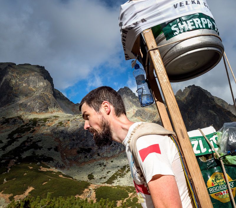 kg sörrel a hátán Braňo Karafa, a Téry menedékház (Téryho chata) teherhordója