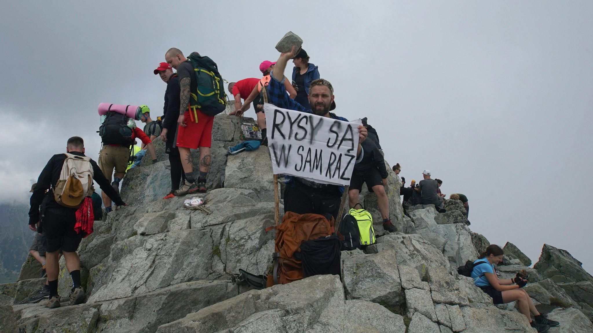 Tengerszem-csúcsra. Arek a hátizsákjára tűzött „Rysy są w sam raz” (A