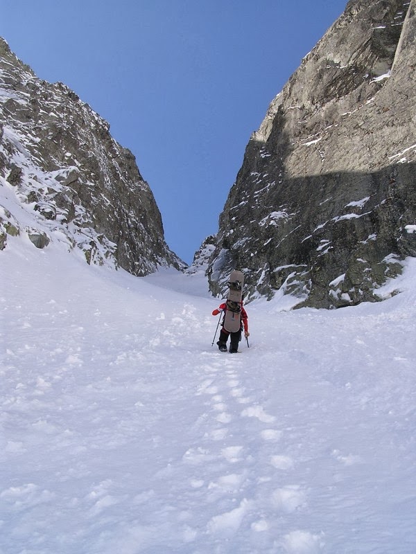A napsütéses teraszunkról a Tengerszem csúcsot (Rysy) csodáltuk reggeli közben, majd a völgy vége felé haladva kerestük a kuloárunkat, hogy fél 9-kor a törmeléklejtő aljánál kezdjük a mászást. A lejött lavinák kijelölték az útvonalat. Egyik alapszabályunkat, mely szerint egy ismeretlen kuloárral ismerkedjünk, mielőtt lecsúszunk, nem tudtuk nem betartani. A kuloár fekvése kompenzálta a viszonylag késői beszállásunkat, de minimum egy ilyen sötét, árnyékos, rideg szörnyeteget vártunk.