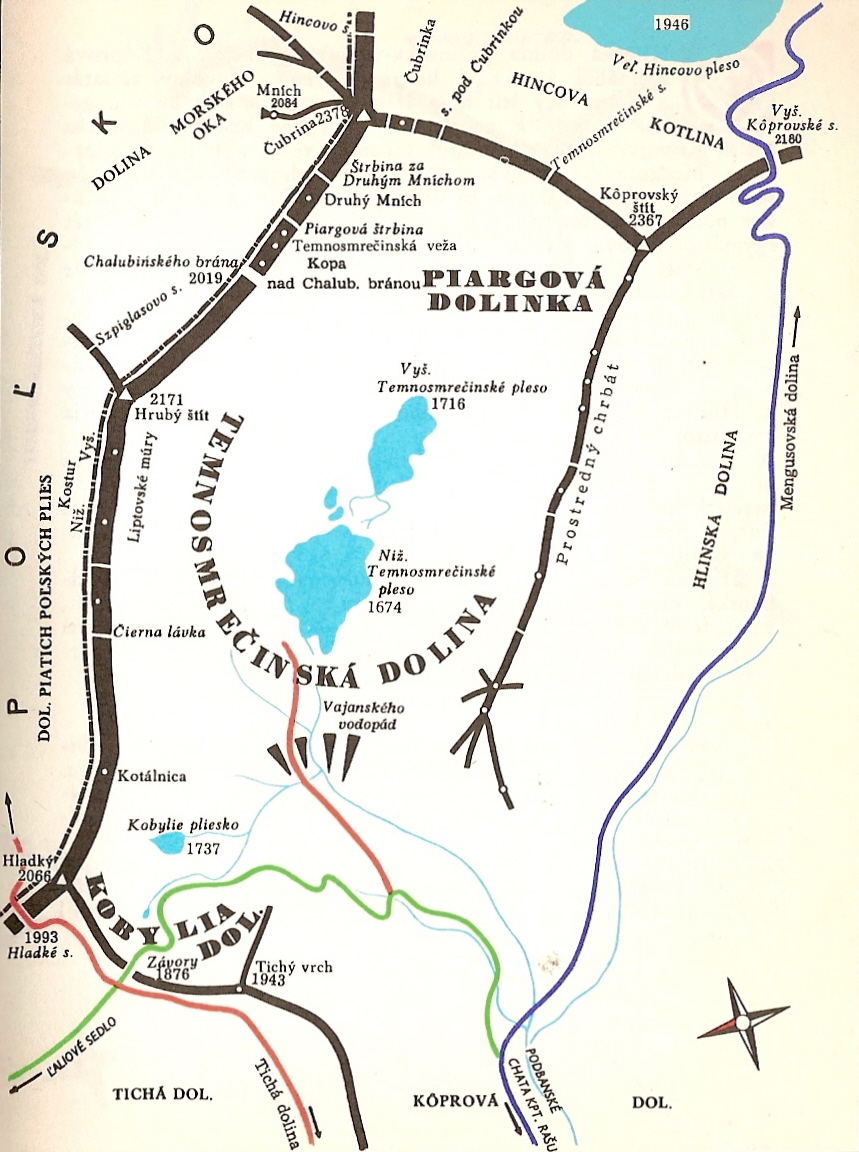 „Temnosmrečinská dolina… Mindkét tó, illetve tengerszem, a felső és az alsó, e völgy igazgyöngyei, szépségükkel felüdítik a völgy romantikus zugát. A felső tótól kényelmesen feljuthatunk a Magas-Tátra főgerincén fekvő Chalubiňského brána nyeregbe.”