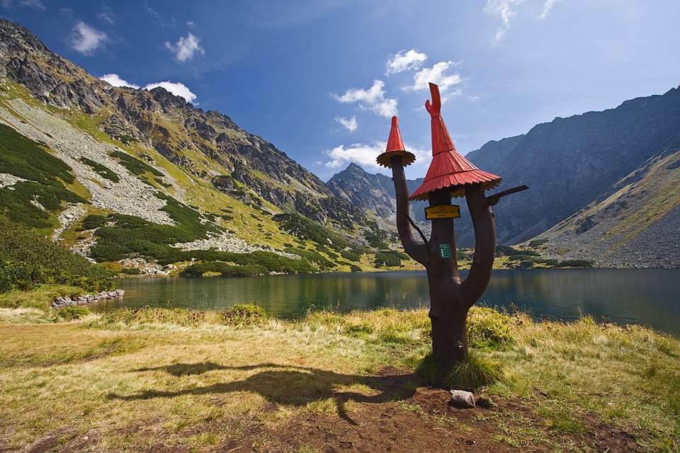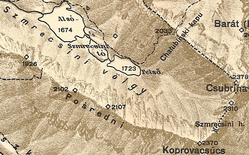 „Chałubiński-kapu… Innen jól taposott vörös jelz. ösvényen leszállunk a Szmrecsini-tavak völgyébe és (¾ ó.) elérjük a Felső Szmrecsini tavat (1723 m) és ¼ ó. alatt az Alsót is (1674 m.)”