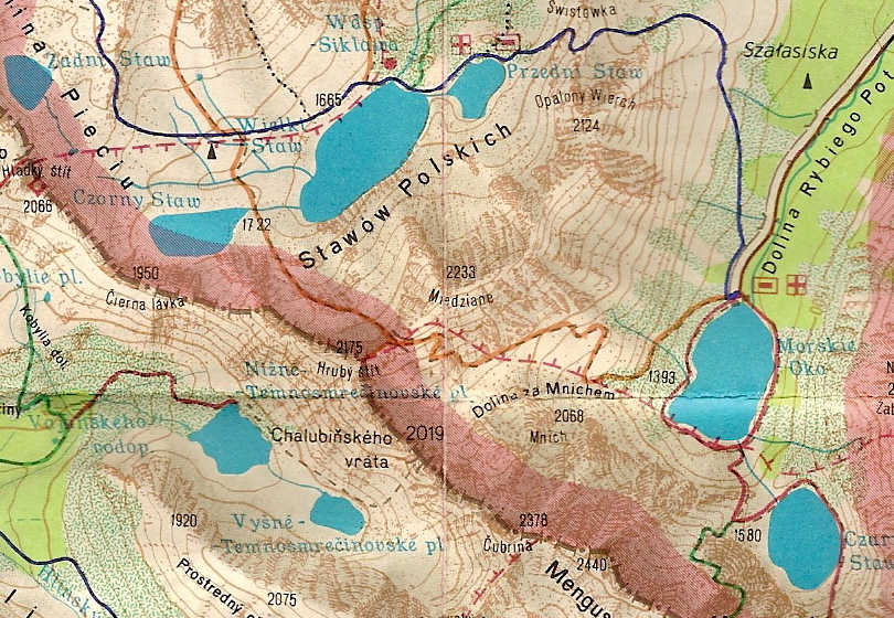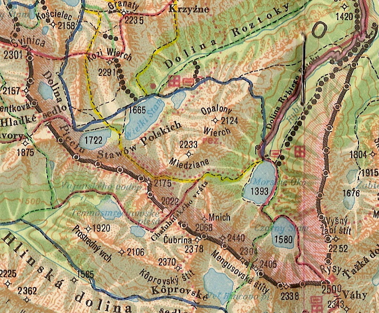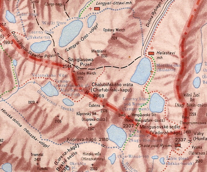 Az 1960-as térképhez hasonlóan ezen is látható a Fenyves-tavi-völgyből a Chałubiński-kapun át a Barát-völgybe vezető piros jelzésű útvonal. A kalauz 12. számú túrája így írja le az útvonalat: