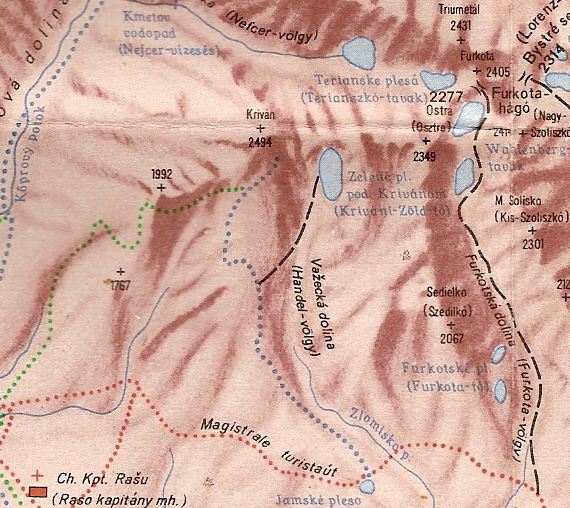 A térképen már az látható, hogy a Krivánra vezető kék jelzésű turistaútból a Kriváni-Zöld-tó irányába egy sárga jelzésű turistaút ágazik el. Ennek időközben csak a színe változott meg, a nyomvonala nem, az 1931-ben zöld jelzésűnek jelzett turistaút ekkor már sárga színnel volt jelezve.