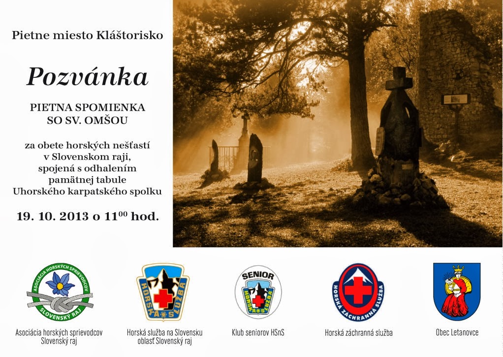 A Hegyi Mentőszolgálat (HZS) meghívja az érdeklődőket a Szlovák Paradicsomban található Menedékkő-fennsíkon lévő kegyeleti helyen 2013. október 19-én, szombaton 11:00 órakor tartandó megemlékezésre, melyet hagyományosan az adott hegységben balesetet szenvedett áldozatok emlékére rendeznek meg minden év őszén Szlovákia hegységeiben. A Szlovák Paradicsomban tartandó megemlékezés keretében a hegység áldozatainak kegyeleti helyén felavatják a Magyarországi Kárpátegyesület emléktábláját. A megemlékezésre várják a hegyekben elhunytak rokonait, barátait, valamint az érdeklődő turistákat.