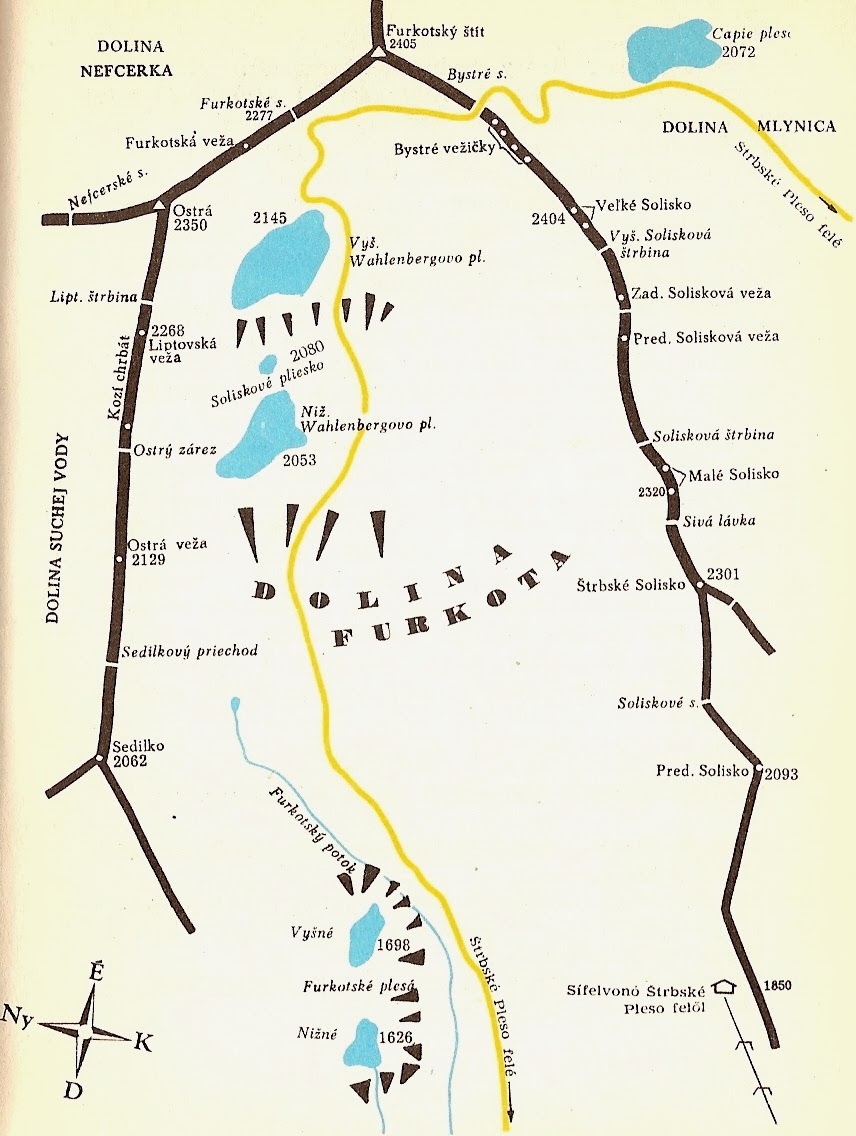 „A Furkota völgyön sárga jelzésű út halad felfelé, mely a Wahlenberg tavak fölé kanyarodva a Furkotský štít csúcs alatt a Bystré sedlo nyergen keresztül a szomszédos völgybe, Mlynická dolina-ba vezet.”