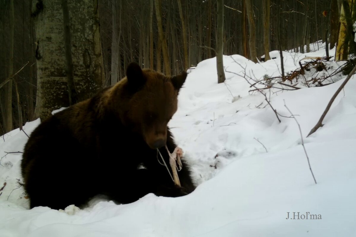 Elmondta azt is, hogy a természetes növényi táplálékkínálat ilyenkor még mindig viszonylag gyenge, így a medvék ilyenkor természetes ösztöntől vezérelve részt vesznek az elhullott állatok keresésében. A télen kimerültség, öregség, betegség és sérülés miatt elpusztult, vagy a farkasok és hiúzok által levadászott szarvasok, vaddisznók és őzek tetemei, maradványai vonzó célpontok a medvék számára. A medvék finom szaglásukkal hihetetlenül gyorsan és pontosan megtalálják azokat a helyeket, ahol kisebb-nagyobb hóréteg fedi azoknak az állatoknak a maradványait, akik nem élték túl a telet. Egy medve látogatása után ezen a helyen többnyire csak a szőr és a kisebb csonttöredékek maradnak” – tette hozzá Majko. A medvék tehát – más húsevőkkel együtt – egyfajta „takarító személyzetként” fontos egészségügyi feladatot látnak el a természetben, ezen kívül megakadályozzák az elhullott állatokból szétterjedő betegségek terjedését.